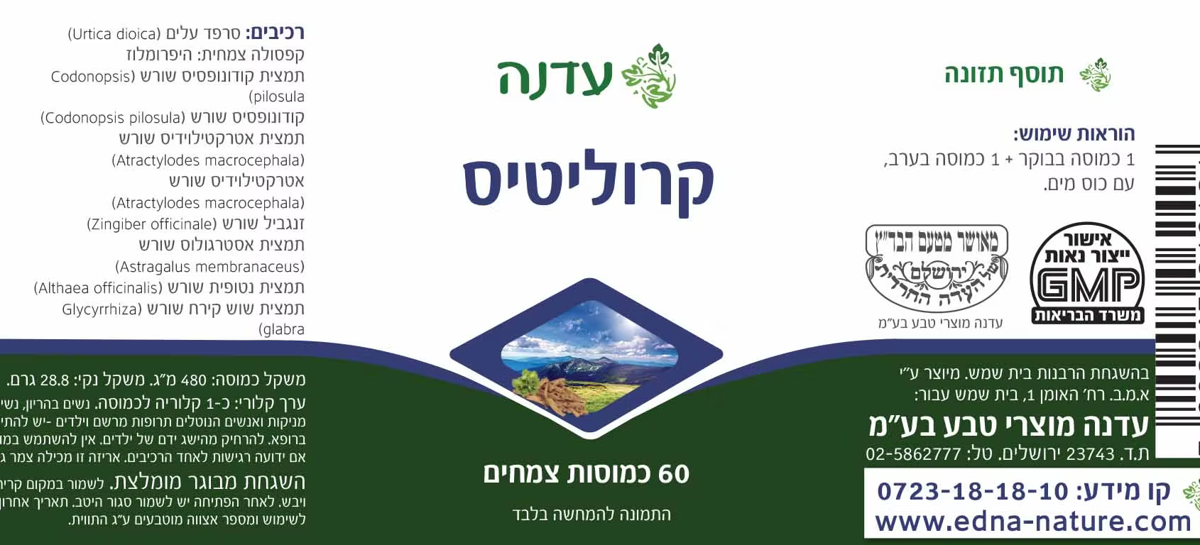Experience the gentle power of Crolitis, an expertly formulated herbal supplement from Edna Nature, crafted to support your digestive health and overall well-being. Drawing from time-honored herbal traditions and supported by scientific research, Crolitis blends seven potent herbs renowned for their soothing, anti-inflammatory, and immune-boosting properties. Perfect for those looking to ease digestive discomfort, strengthen natural defenses, or maintain daily vitality, Crolitis offers a holistic, nature-inspired solution. Take charge of your wellness journey with this unique supplement, designed to nurture and balance your body from within.