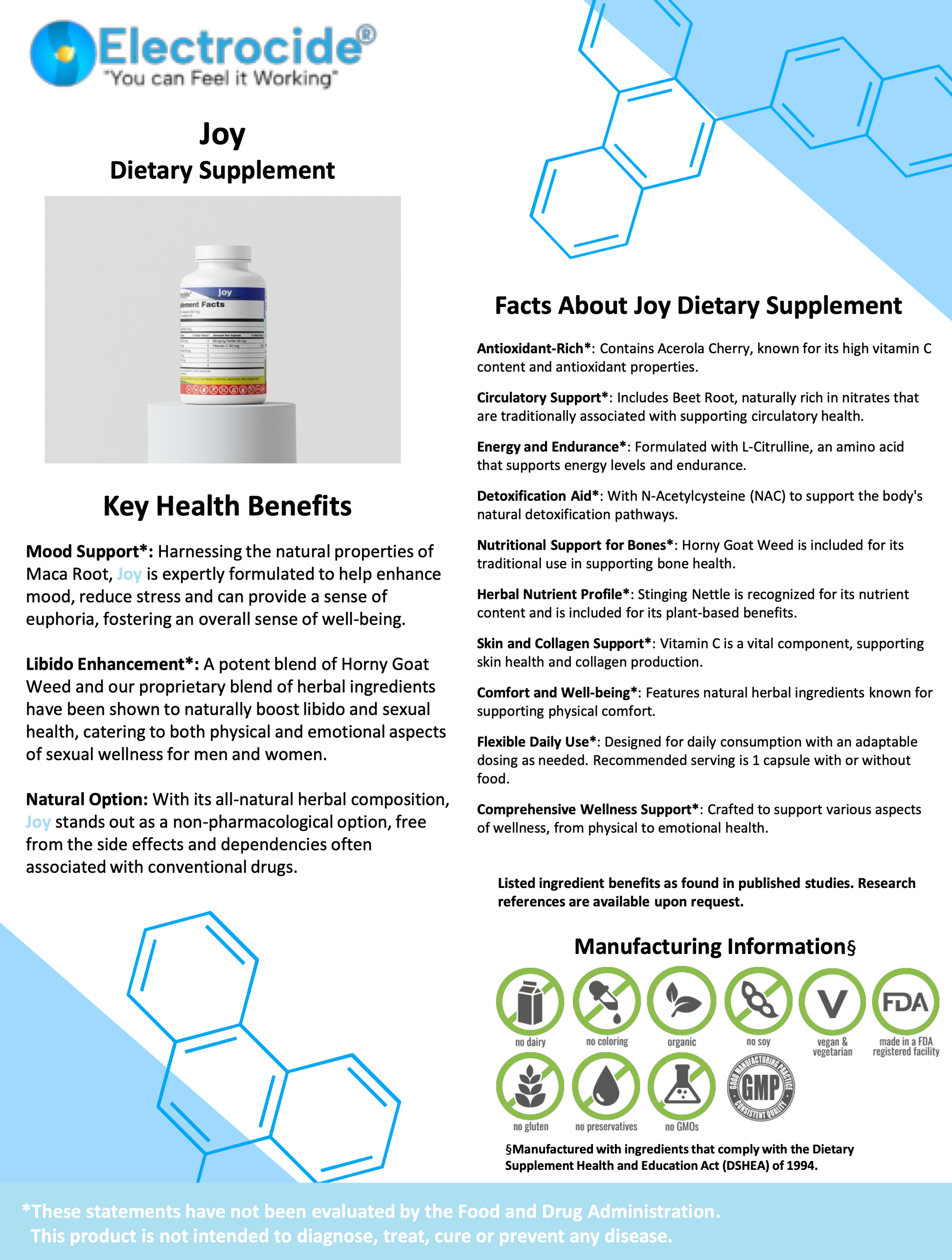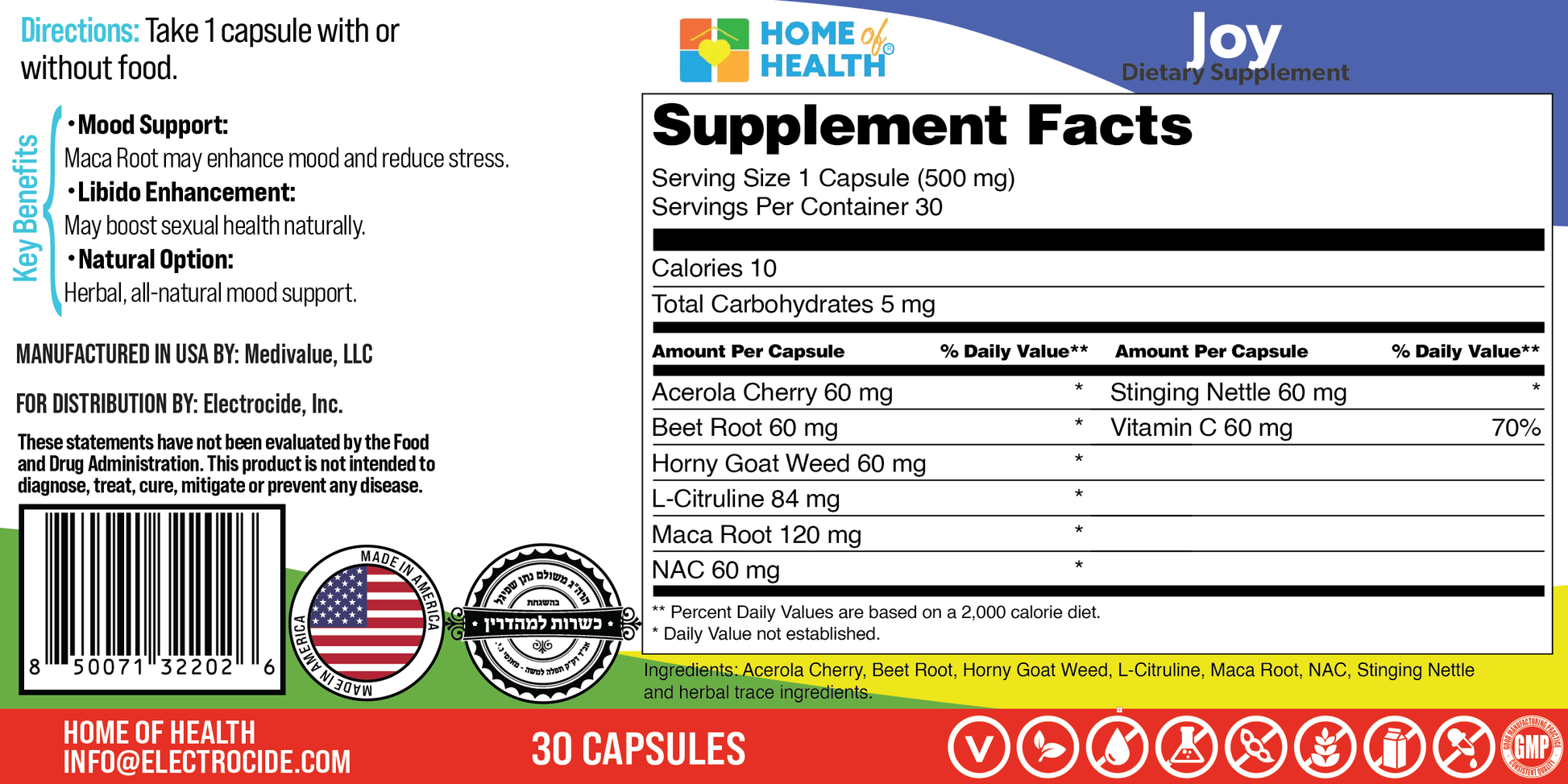Joy is your natural path to elevated mood and vitality, blending herbal roots and nutrients to support emotional balance and sexual health in a single capsule. We formulated this plant-based supplement for those seeking a holistic lift, with maca root recognized for enhancing mood and reducing stress, while horny goat weed may boost libido naturally. And to broaden its benefits, we included L-citrulline for energy and endurance, NAC for detoxification aid, and vitamin C for skin and collagen support, making it a versatile daily option. Wellness encompasses mind and body synergy, with beet root offering circulatory assistance and acerola cherry providing antioxidant-rich vitamin C. Explore the highlights: stinging nettle contributes to comfort and well-being, creating a comprehensive profile for nutritional harmony. Hypoallergenic, allergen-free, and made in the USA, Joy delivers flexible support for life's joyful moments. Ready to embrace a natural mood enhancer?