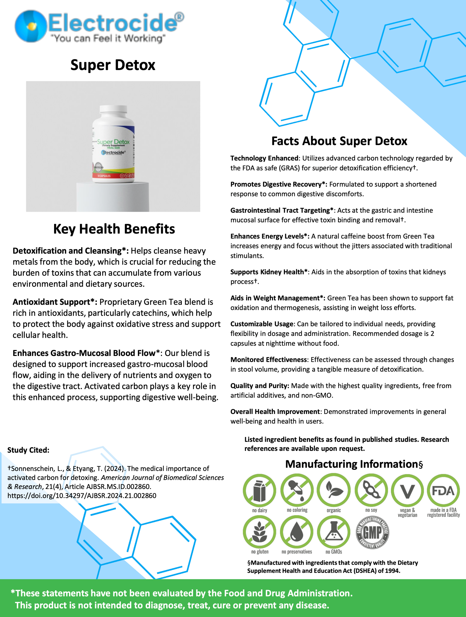 Super Detox is your advanced solution for cleansing, utilizing FDA-recognized safe activated charcoal technology for efficient toxin binding in a trial-size capsule. We engineered this plant-based supplement for those aiming to purge environmental toxins including heavy metals, with a proprietary blend of activated charcoal and green tea to support detoxification and antioxidant activity. And to target gastrointestinal tract, it acts at gastric and intestinal mucosal surfaces for effective removal, promoting a shortened response to common digestive discomforts. Detoxification and nutrient delivery are essential for wellness, with green tea potentially boosting gastro-mucosal blood flow. Explore the innovation: the formula enhances digestive recovery through its GRAS-rated carbon for superior efficiency. Hypoallergenic, free from common allergens, and made in the USA, Super Detox offers a gentle way to embrace periodic renewal. Ready to feel the targeted cleanse for refreshed vitality?