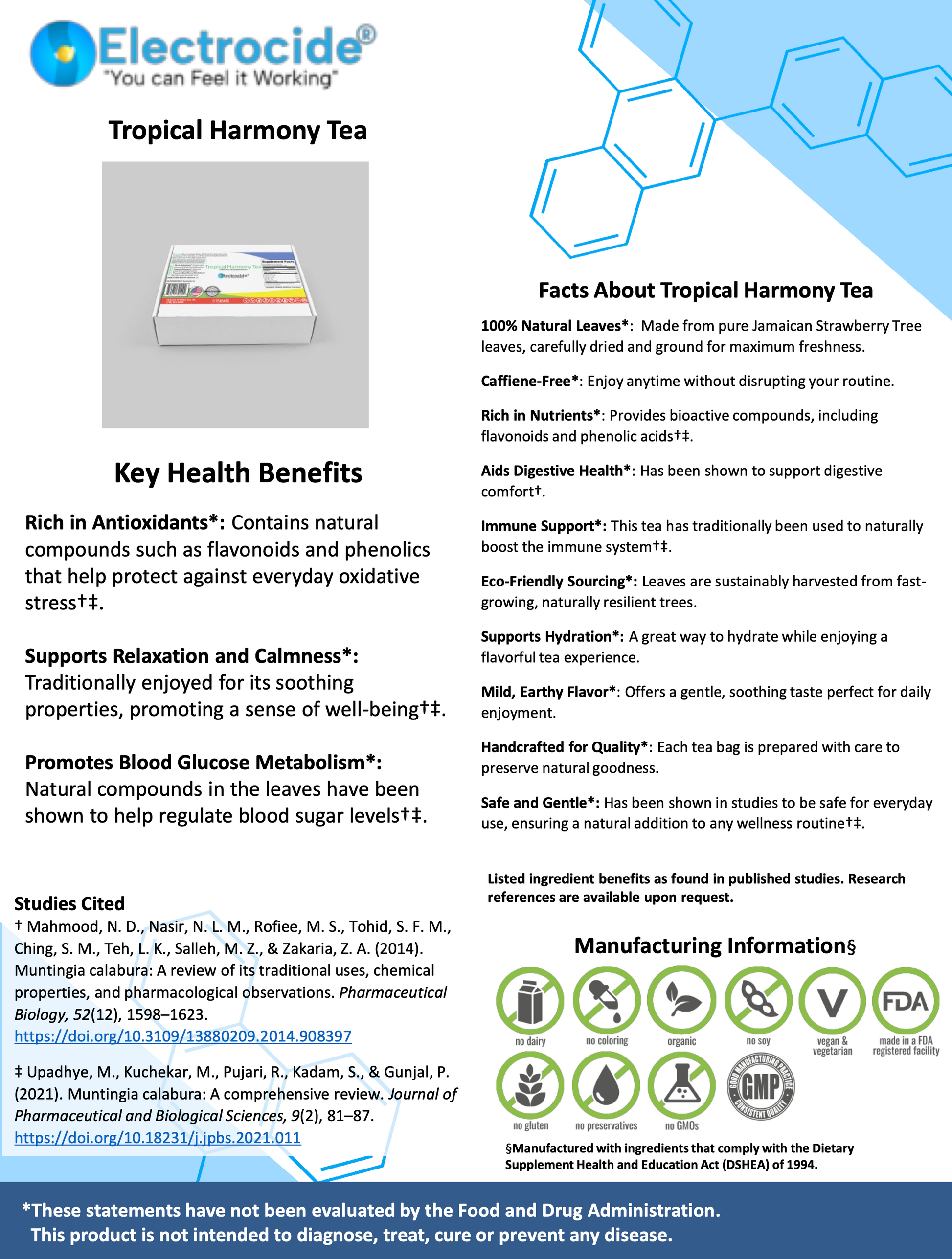 Tropical Harmony Tea is your soothing sip of nature, made from 100% pure Jamaican Strawberry Tree leaves to deliver a caffeine-free, nutrient-rich infusion for daily wellness. We sourced this plant-based tea from sustainably harvested, fast-growing trees, offering a mild, earthy flavor that's perfect for hydration and enjoyment anytime. Rich in bioactive compounds like flavonoids and phenolic acids, it provides antioxidant support to help fight oxidative stress, while traditionally enjoyed for its soothing properties that promote relaxation. And for added benefits, it may aid digestive health and immune support, with potential to promote blood glucose metabolism for overall vitality. Eco-friendly and gentle, this tea supports a shortened response to common digestive discomforts and enhances gastro-mucosal blood flow for nutrient delivery. Safe for everyday use, hypoallergenic, free from common allergens, and made in the USA, Tropical Harmony Tea invites you to embrace a flavorful, healthful ritual. Ready to hydrate and harmonize naturally?